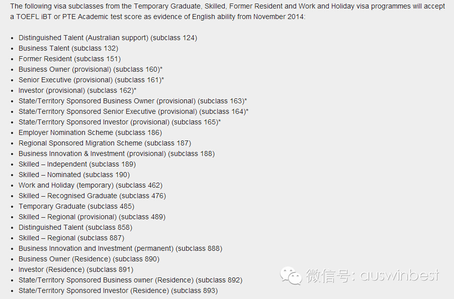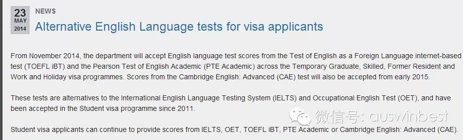 根据澳大利亚移民局官网消息,从本月开始,TOEFL, PTE和CAE测试成绩将被澳洲移民局正式承认和接受,几乎可以用于所有工作,技术移民和暂居签证类别的申请。