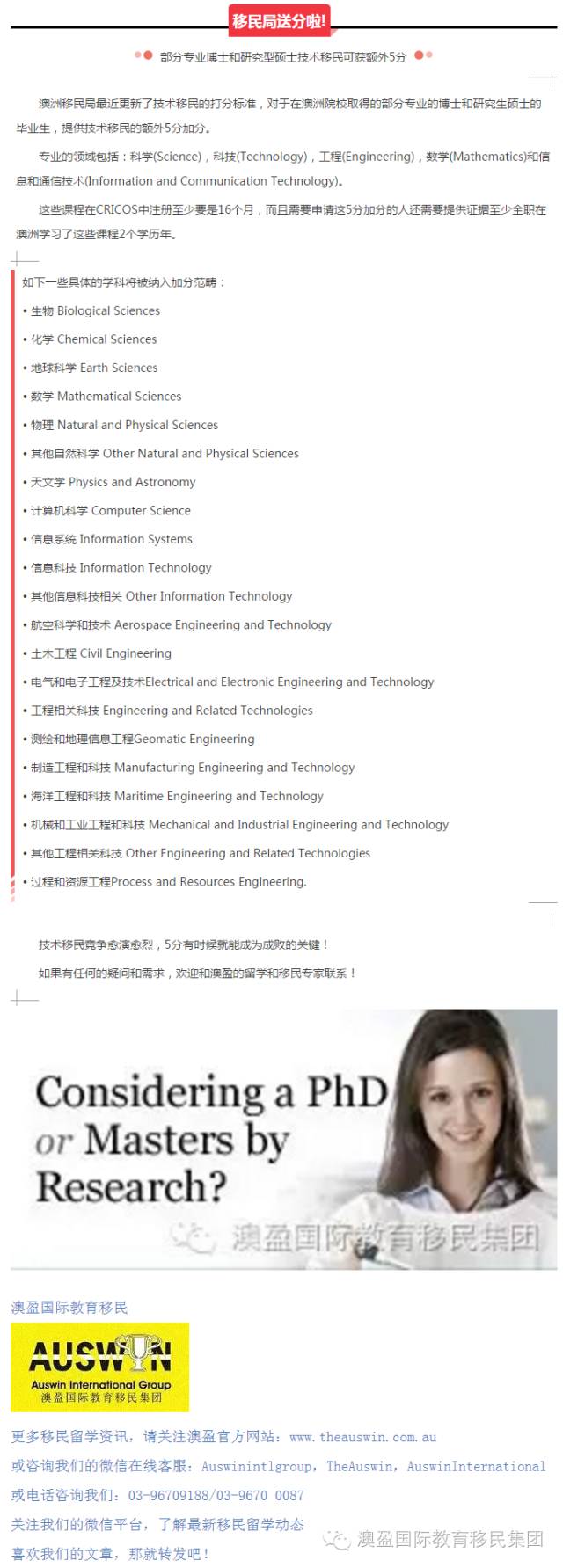> 移民局送分啦! 部分专业博士和研究型硕士技术移民可获额外5分