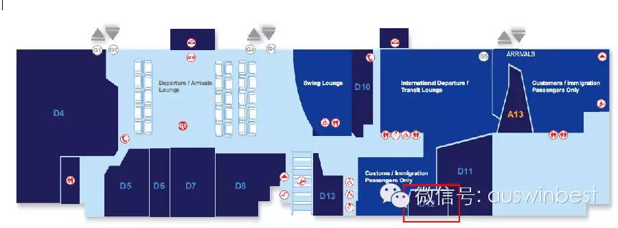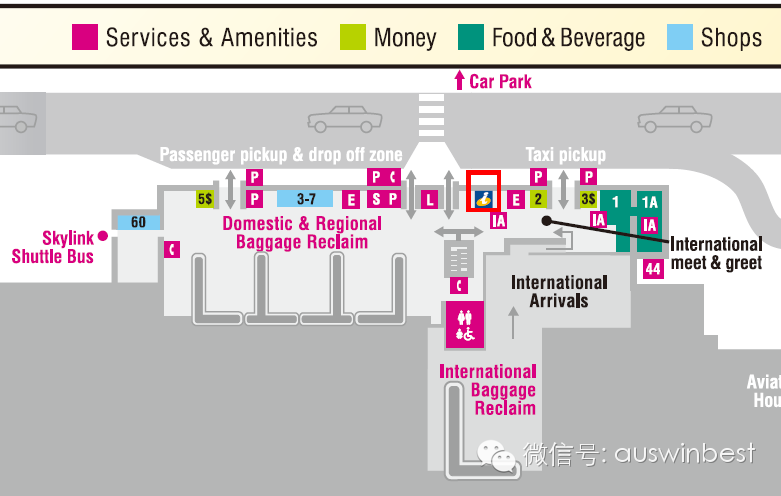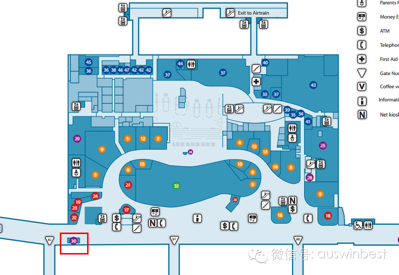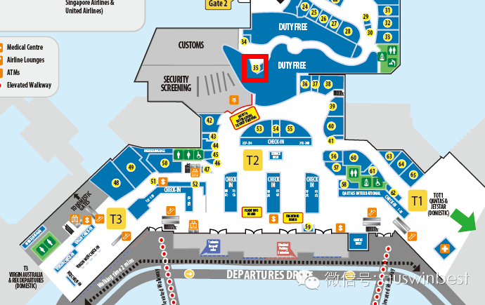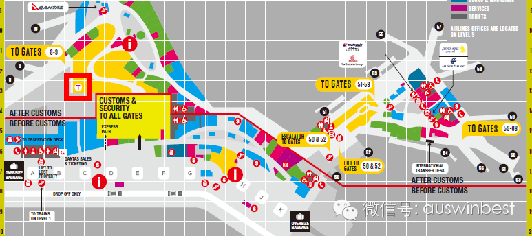 底层GroundFlor,自动扶梯旁边,QANTAS服务站附近
